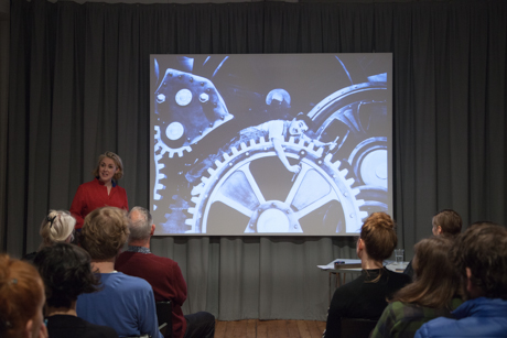 Image: Cathy Haynes presenting ‘Why the clock is to time what laminate flooring is to trees’, Chisenhale Gallery, April 2014. Photo: Manuela Barczewski